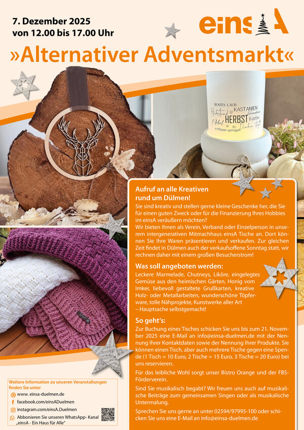Wir laden am Sonntag, den 7. Dezember 2025, von 12:00 bis 17:00 Uhr wieder zum alternativen Adventsmarkt ein. Parallel zum verkaufsoffenen Sonntag in der Innenstadt bietet die Veranstaltung eine Plattform für Kreative, Vereine und Initiativen aus Dülmen und Umgebung.