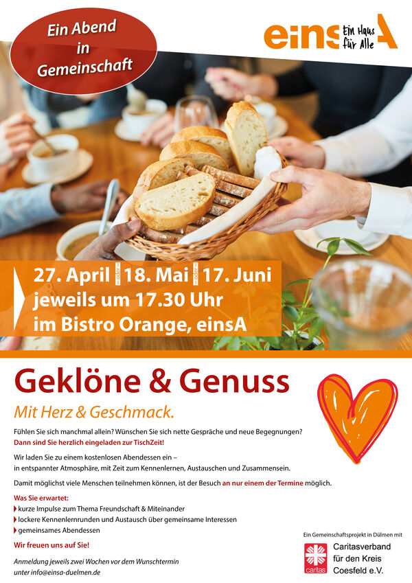 Das Projekt „Geklöne mit Genuss“ richtet sich gezielt an Menschen, die sich nach Gemeinschaft sehnen. In Kooperation mit der Caritas laden wir zu einem kostenlosen Abendimbiss ins einsA ein. Bei dem Abendimbiss starten wir mit einem inhaltlichen Impuls. Nach dem gemeinsamen Essen bieten wir Raum für Austausch über gemeinsame Interessen wie Bewegung, Kultur oder Kreativität. „Geklöne mit Genuss“ verbindet Menschen und soll neue soziale Netzwerke fördern und bestehende Unterstützungsangebote bekannter machen. Die Veranstaltung ist nach einer Anmeldung kostenfrei!